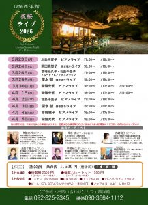 《西洋館 夜桜ライブ2026》 2026年2月23日/カテゴリ: 《カフェ西洋館 駐車場拡張のお知らせ》 /作成者: seiyoukan 毎年恒例の夜桜ライブまであと1ヶ月となりました。 ご予約受け付けております 視覚、聴覚、味覚が存分に楽しめるライブになっております 《西洋館 夜桜ライブ》 【出演アーティスト】 常盤充代(ピアノ) 深水郁(ピアノ弾き語り) 赤崎雅子(ピアノ) 北島千夏子(ピアノ) 草場紀久子(フルート) 飛田真悠子(ピアノ弾き歌い)